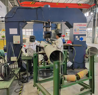 Schweißen: Ähnlich wie bei der UOE (Unterpulverschweißen) erfolgt hierbei ein hochpräzises Vorschweißen, gefolgt vom Innen-/Außen-Unterpulverschweißen.